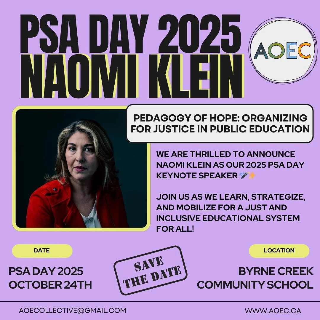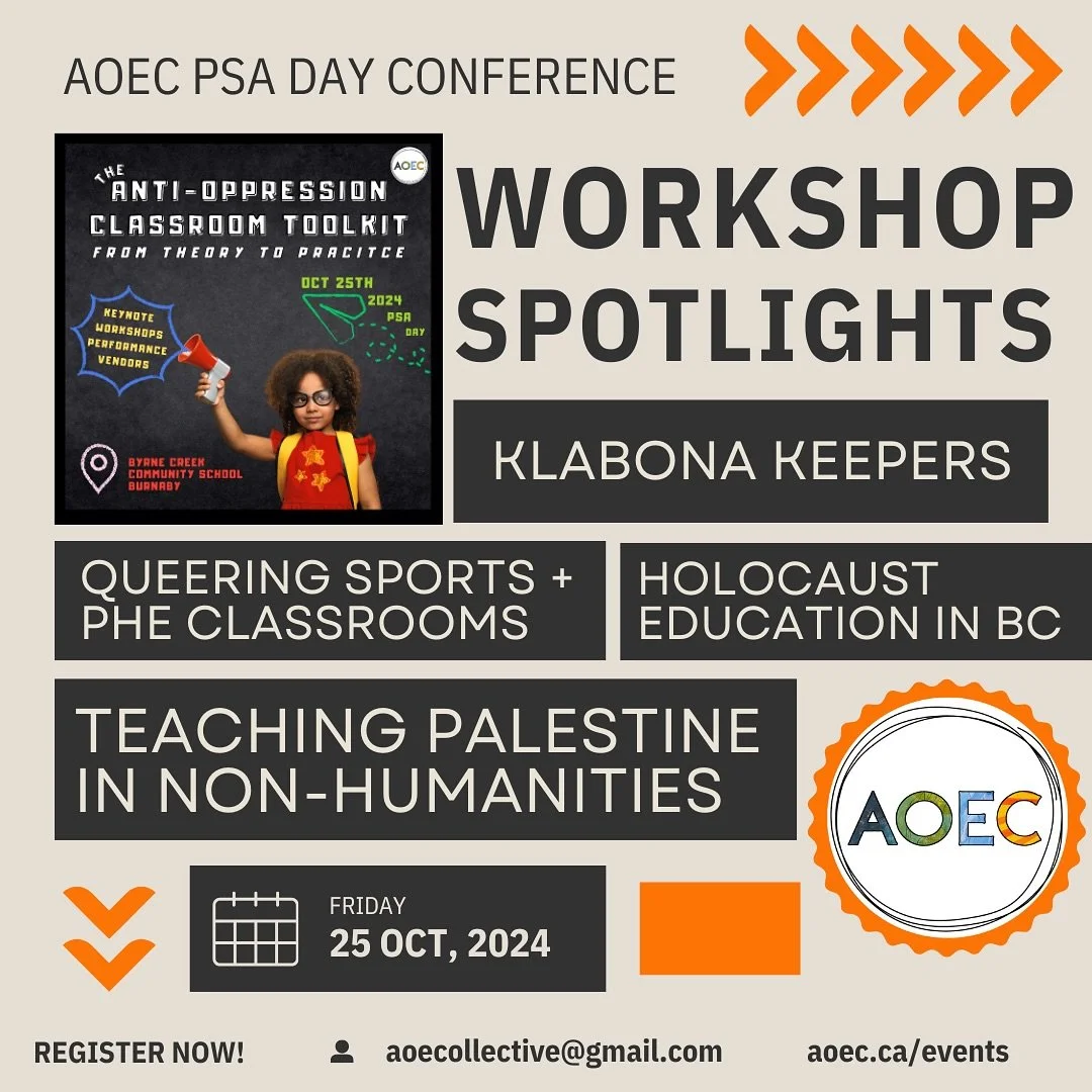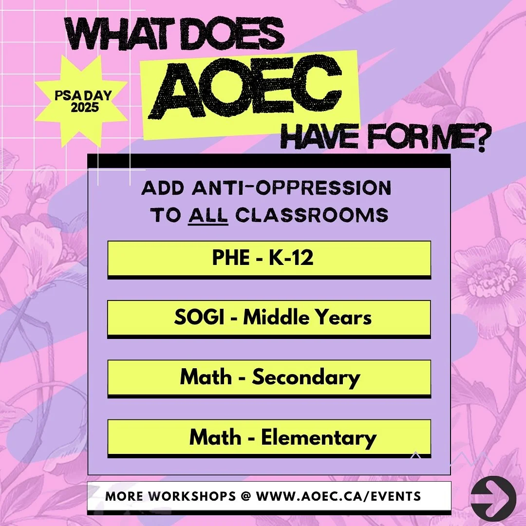 The Anti-Oppression Educators Collective (AOEC) is a provincial specialist association dedicated to challenging systemic oppression in education. Originally known as the BC Peace and Global Educators, our PSA underwent a name change in 2019 to become the Anti-Oppression Educators Collective. Our name change reflects our commitment to ensuring our work in peace and international solidarity is grounded in an anti-oppressive framework.